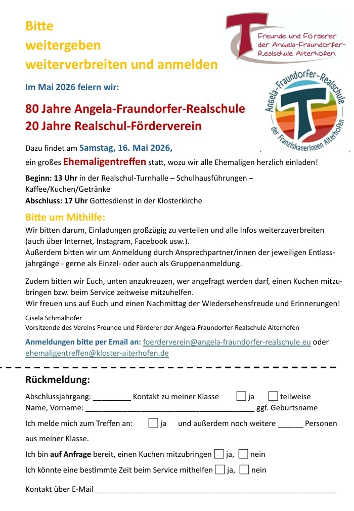 Der Förderverein der Angela-Fraundorfer-Realschule lädt alle Ehemaligen der Schule zum großen Ehemaligentreffen und 20-jährigen Jubiläum des Fördervereins sehr herzlich ein.